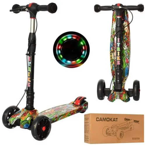 • Самокат оснащений трьома колесами, які забезпечують стійкість та безпеку.