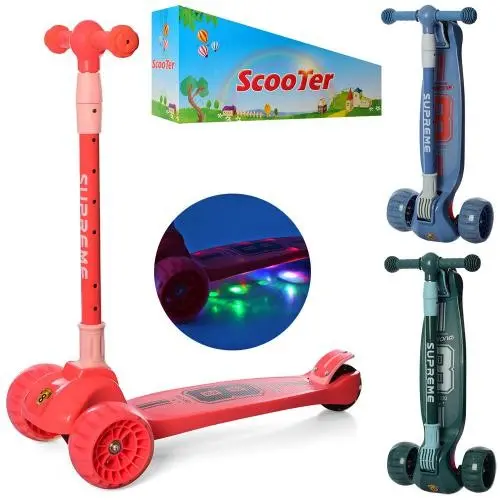 - Самокат оснащений трьома колесами, які забезпечують стійкість та безпеку.