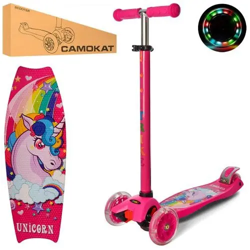 - Самокат оснащений трьома колесами, які забезпечують стійкість та безпеку.