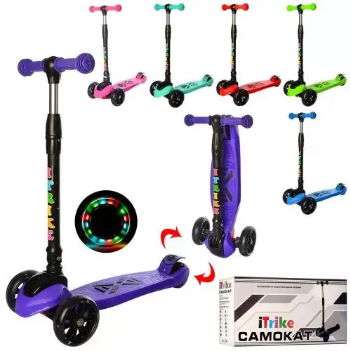 - Самокат оснащений трьома колесами, які забезпечують стійкість та безпеку.
