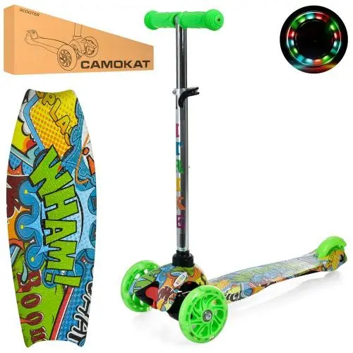 - Самокат оснащений трьома колесами, які забезпечують стійкість та безпеку.